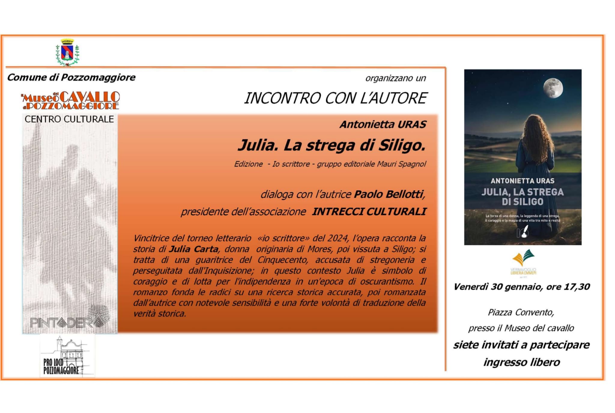 Venerdì 30 gennaio alle ore 17.30 nella Piazza Convento presso il Museo del Cavallo, Paolo Bellotti, presidente dell'associazione Intrecci Culturali dialoga con Antonietta Uras autrice del libro "Julia. La strega di Siligo".