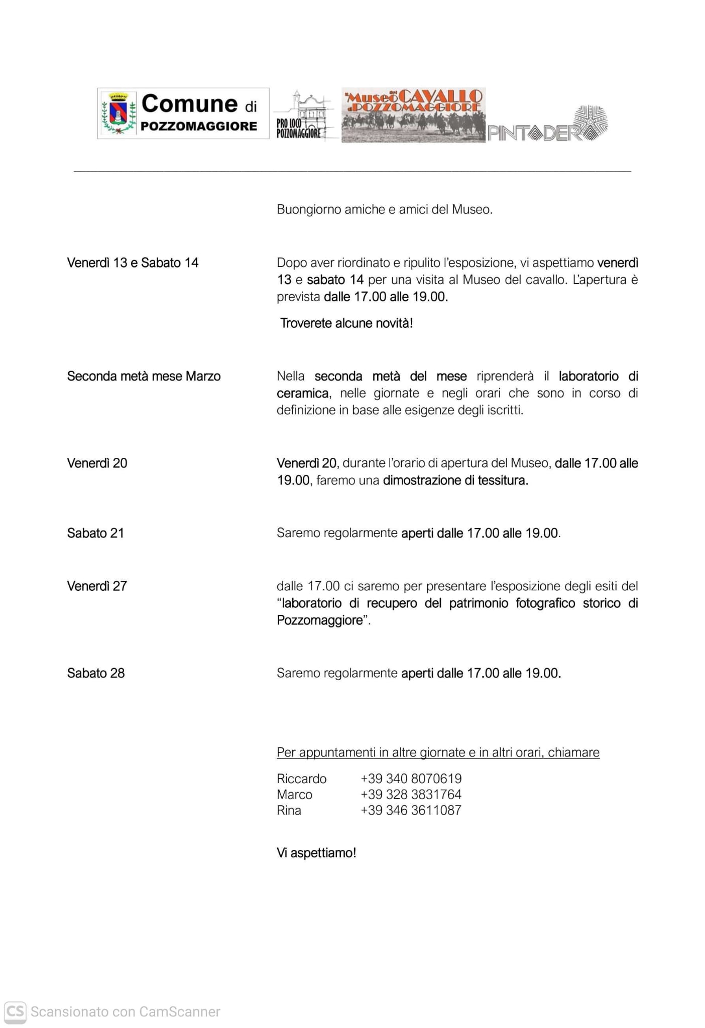 Per il mese di marzo tante novità al Museo: avrà inizio il laboratorio di ceramica, ci sarà una dimostrazione di tessitura, verranno esposti i risultati del recupero del patrimonio fotografico storico di Pozzomaggiore....